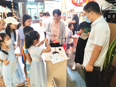 借助缤纷的夏日游园的形式,市集中推出了趣味游园会,小朋友们在服务台领取集章卡,在市集各打卡点参加活动,投壶、叠叠乐、电碰迷宫、踩高跷,不少小朋友还发现了隐藏章哦。