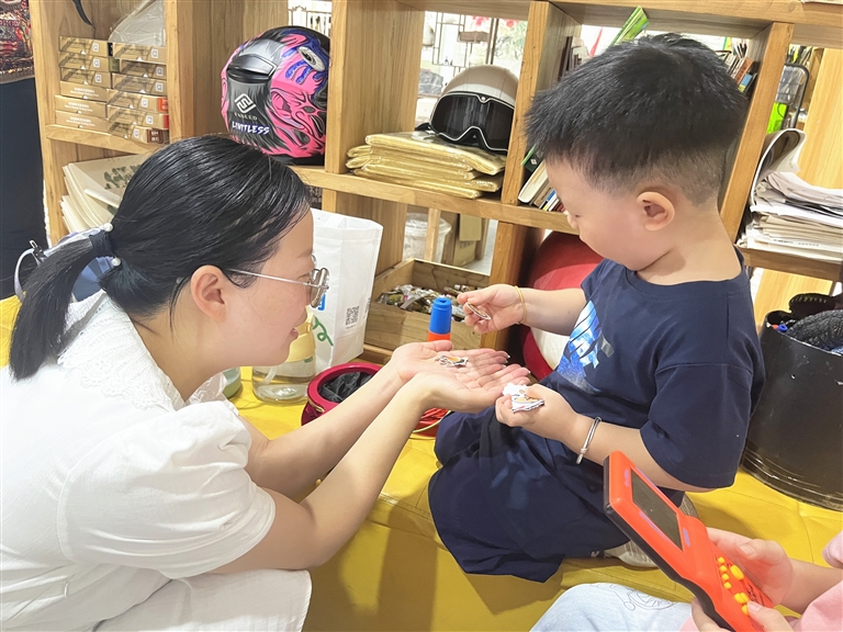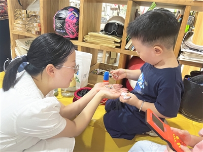 “宝宝,快看,老师给你带来了什么玩具。”一进门,看到宝宝有些胆小怕生,老师们便拿出提前准备好的玩具,吸引宝宝的注意力。“宝宝会先和玩具发生互动,在接纳了这个玩具后,才有可能去接纳玩具背后的人。”老师们还说,通过宝宝喜爱的玩具,她们想要传递给宝宝一个信息:老师和宝宝是一样的,都喜爱玩具,可以成为朋友。随后,老师们和宝宝一起观察花瓶中的向日葵,并用手撕纸的方法动手做了一朵向日葵。渐渐地,宝宝似乎在老师身上找到了信赖感,拉着老师的手,将向日葵送给了亲爱的爸爸妈妈。