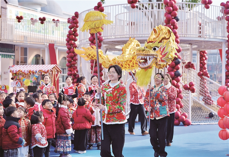 近日,益农荣盛幼儿园举办第二届“趣玩传统 味品乡俗”传统文化节。活动现场,舞龙、打年糕等沉浸式体验,让孩子们在欢声笑语中扎下了文化根芽。