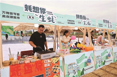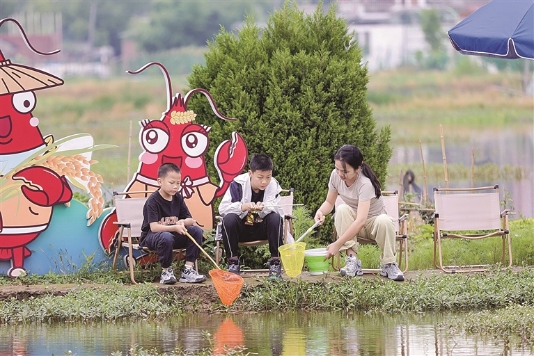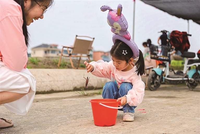 “本来只是听说这里有个稻虾节,想着来这里遛遛娃。没想到还有这么多活动,钓龙虾、做饭团、吃龙虾、画草帽,又能吃又能玩,大人小孩一起动手,太有意思了!”提着满满一桶活蹦乱跳的小龙虾,王女士一家乐呵呵地前往隔壁的美食潮集市,他们想再买些美食填饱肚子,也想带些这里的特色农产品回家。