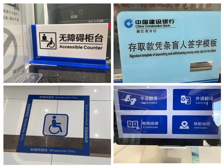 平整和缓的无障碍坡道,台面延长的无障碍低位柜台,内置助听器手写板等的信息无障碍设备箱,内设带扶手坐便器的无障碍卫生间,为聋哑人士准备手语视频让他们了解业务办理流程,在劳动者港湾区域设置了便民服务柜,配置了老花镜、放大镜、助听器等便民物品……建行萧山支行营业部处处体现客户至上的理念,让客户在网点全流程体验无障碍金融服务。