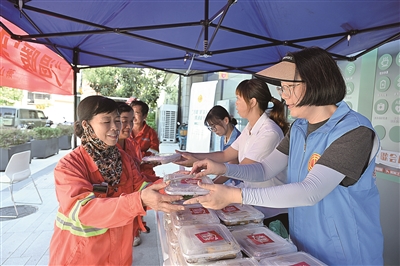 昨日,城厢街道育才东苑社区爱心驿家开展免费爱心餐活动,将美味和关怀送给快递员、外卖配送员、保洁等户外劳动者。 记者 范方斌 摄