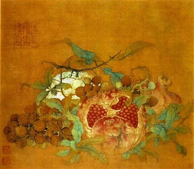 台北故宫博物院的另一件藏品,南宋吴炳的《榴开见子图》,以散页绢本的形式,将秋日石榴的丰盈之态定格于方寸之间。这幅作品通过画面中肥硕的果实、灵动的柳莺,可窥见南宋院体画对自然细节的极致追求。吴炳以细腻的笔法描绘石榴的肌理:桃红色的果皮饱满圆润,紫红色的籽粒鲜嫩欲滴,粒粒分明如真实可触。叶片以没骨法晕染,叶脉以细笔勾出,虫蛀的痕迹与枯萎的边缘均被如实呈现,既无美化亦无贬损,仅以客观的笔触还原秋日的真实。这种对自然细节的忠实记录,体现了南宋院体画“格物致知”的创作理念——通过观察万物,理解生命的规律,进而以艺术的形式表达对自然的敬畏。画面中,一只柳莺闻香而来,这一瞬间的捕捉,将静态的果实转化为动态的生命场景。吴炳通过这种“以动破静”的手法,不仅赋予画面以生机,更隐喻了秋收时节万物之间的共生关系,石榴的成熟为鸟类提供食物,鸟类的活动又促进种子的传播,共同构成自然的循环。