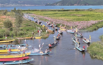 9月16日,2025年四川省凉山州首届泸沽湖转山转海节开幕。转山转海是居住在泸沽湖附近摩梭人的重要民俗。从今年开始,四川省凉山州将每年农历七月廿五正式设立为“泸沽湖转山转海节”,并纳入地方法定节日,盐源、木里两县群众可享受一天专属假期。图为当日,当地群众驾着猪槽船从泸沽湖的洛洼北码头开始转海(无人机照片)。