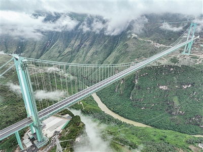 9月26日,雨后的贵州花江大峡谷云雾笼罩,花江峡谷大桥如同“钢铁巨龙”腾跃峡谷之上。花江峡谷大桥是贵州六枝至安龙高速公路的控制性工程,大桥全长2890米,主跨径1420米,是目前世界山区峡谷第一大跨度钢桁梁悬索桥;其桥面距水面垂直高度625米,是新的世界第一高桥。经过三年多建设,贵州花江峡谷大桥将于9月28日正式建成通车。图为当日拍摄的贵州花江峡谷大桥(无人机照片)。