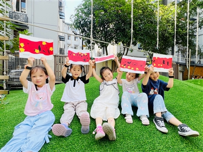 与此同时,小班和中班的教室里也涌动着浓浓的爱国情。孩子们用彩笔、彩纸、黏土等材料认真绘制红旗,每一笔、每一画都是对祖国最纯真的爱;他们举起自制的小国旗,用清脆的童声齐喊“祖国妈妈生日快乐”。这些看似稚嫩的举动,却让一颗颗红心在活动中闪闪发亮。正如机关幼儿园“本真立根,爱润童年”的理念所倡导:爱国,不是背诵口号,而是用孩子的语言,唤醒血脉深处的根脉。