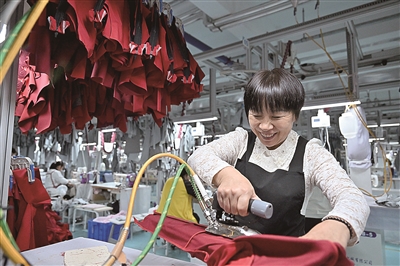 图为10月9日,河南省商丘市睢阳高新区东霞制衣有限公司的工人赶制冲锋衣。