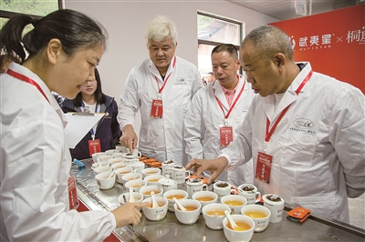 图为10月20日,专家评委在桐木村武夷红茶茶王赛上评审茶叶。
