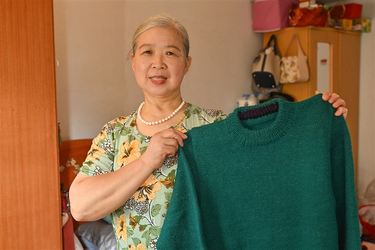 毕业后,许凤英进入杭二棉北织整理车间工作,但她对手工编织的热爱从未减退。她熟练掌握平针、上下针等基本针法,也曾花费一个月的空余时间,为儿子亲手织成一件绿色毛衣。至今她仍珍藏着这件毛衣,那是用一斤二两毛晴线织成的——当时每斤十六七元,是一份并不轻的心意。