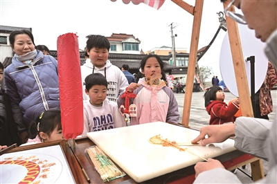 昨天,临浦镇通二村西施娘娘庙举行年俗节活动,男女老少搡年糕、吃糖画、写对联,过年的气氛越来越浓了。