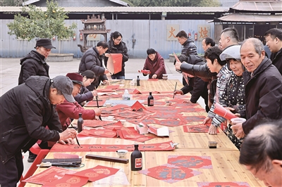 近日,绍兴柯桥区书法家协会的会员走进新塘街道联华新村,以笔墨书写祝福,将一副副春联送到村民手里。