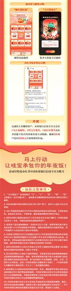 6.年夜饭大奖将在2月13日前通过支付宝口令红包发放等值现金形式发放,中奖人可于收到发奖通知日当日复制口令至支付宝领取2026元红包,过期不补。对奖品或活动如有疑问可与农业银行信用卡小红书官方账号私信沟通,或咨询农业银行信用卡客服电话40066—95599。