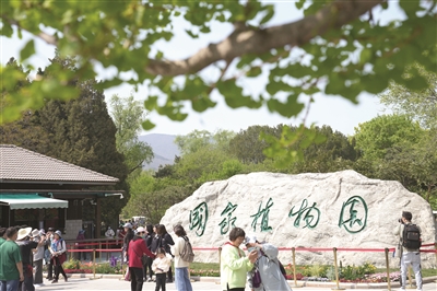 作为国家植物园体系的重要组成部分,国家植物园当日在北京正式揭牌,中国生物多样性保护事业再次迈出新步伐。此次设立的国家植物园,是在中国科学院植物研究所(南园)和北京市植物园(北园)现有条件的基础上扩容增效整合而成,总规划面积近600公顷。图为4月18日,游客在国家植物园入口处参观。