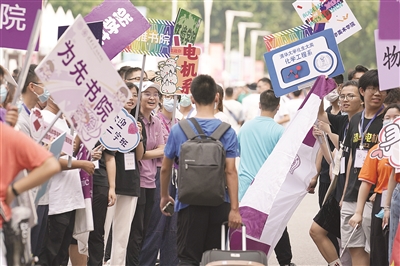 8月17日,在清华大学迎新点,学生举着院系牌迎接新生入学。当日,清华大学3700余名2022级本科新生入学报到,开启大学生活。据介绍,2022年清华大学录取本科新生包括内地学生3400余人、港澳台学生80余人、国际学生约200人。