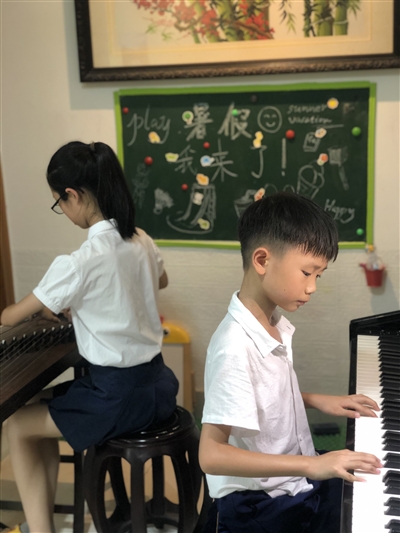义蓬一小506班的钱艺涵在暑假新学了《四合如意》《井冈山上太阳红》等古筝曲。“《四合如意》速度比较快,颤音和音比较多,《井冈山上太阳红》左右手合并的部分比较多。”艺涵对这几首曲子的特点和难度了然于胸。学习乐器需要日复一日的努力,对于即将进入毕业班的钱艺涵来说,学习任务需要占据她大部分的精力。尽管如此,她还是坚持每天进行半小时到一小时的古筝练习。同在义蓬一小的弟弟钱艺天则在暑假期间练起了钢琴,《京剧小段》和《假日的时光》是他的新收获。对妈妈来说,姐弟俩每天自觉练习,着实令人欣喜。