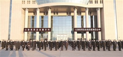 北京西郊机场国旗半垂,气氛庄严肃穆,黑底白字横幅上写着:“江泽民同志永垂不朽”“江泽民同志永远活在我们心中”。习近平和夫人彭丽媛等胸佩白花、臂戴黑纱,神情凝重地在停机坪肃立。