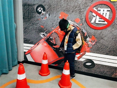 在模拟酒驾的环节,警察叔叔给我们戴上了特制的眼镜,戴上之后我的头晕乎乎的,再绕着障碍物走,我已经找不到方向了,我好像只看到满天的星星,太真实了,原来醉酒会是这样的感觉。