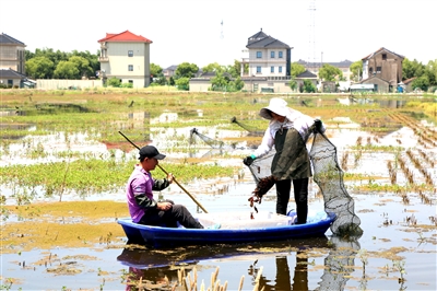 党湾镇庆丰村的稻田与众不同,田里不仅插着稻梗,还浮着水草、放着虾笼。近年来,全市大力推进稻渔综合种养生产项目,庆丰村的这片稻田便是乘着“渔农结合生产”东风的优秀生产地——浩瑞农业稻虾共养基地。