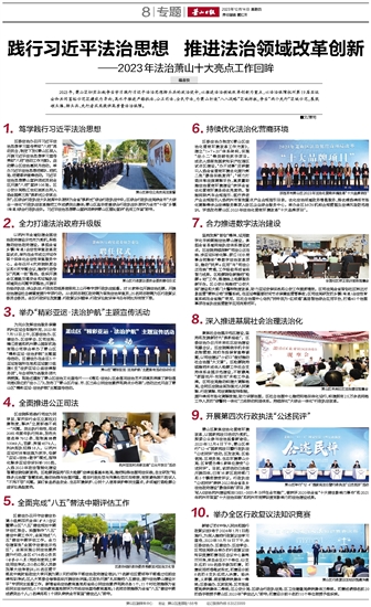 2023年,萧山区切实扛起争当学习践行习近平法治思想排头兵的政治使命,以推进法治领域改革创新为重点,以法治保障杭州第19届亚运会和共同富裕示范区建设为导向,高水平推进严格执法、公正司法、全民守法,为萧山打造“八八战略”区域样板,争当“两个先行”区域示范,展现领头雁、排头兵、先行者风采提供高质量法治保障。