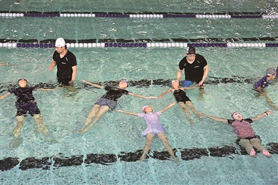 图为区文化旅游体育发展服务中心的游泳馆,教练员正带领小朋友们在浅水区域练习憋气、换气、仰漂等基本动作。
