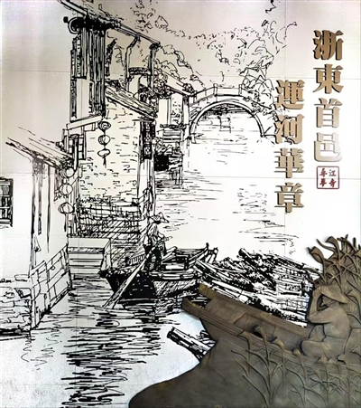 浙东运河萧山段场景速写画图(摄自江寺《浙东运河萧山展示馆》)