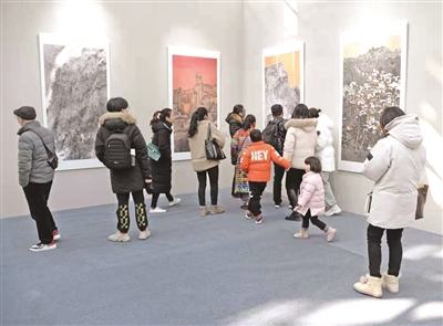 近日,市民来到瓜沥镇体育中心,观看伯年国艺全国山水画作品展。