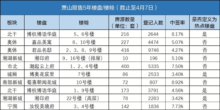 随着大量人才的进入,以及不少家庭改善住房需求的落实,不少热门楼盘的中签率也在降低。从“萧山限售5年楼盘/楼幢”一表中也可以看出,每个板块都精彩纷呈,奥体、市北、湘湖新城、宁围等板块都有楼盘或楼幢需“限售5年”。目前,全区已有1820套新房需限售5年。