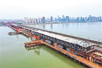 近日,钱塘江新建大桥完成钢桁梁第五轮顶推施工,南北岸“牵手”在望。大桥建成通车后,将串联起萧山国际机场、钱江世纪城、钱江新城、东站枢纽、城西以及铁路西站枢纽。 首席记者 唐柯 摄