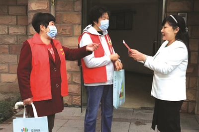 近日,北干街道组织社工和楼道小组长挨家挨户做好接种新冠疫苗宣传工作,提高居民的知晓率。图为加德社区社工和楼道小组长正在入户宣传。