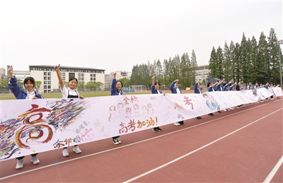 高考即将来临,萧山中学高一年级学生共同绘制一个长卷,为高三学长高考加油助力。