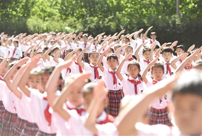 5月28日,河北省石家庄市神兴小学举行以“童心向党 争做新时代好队员”为主题的少先队员入队仪式,小学生们在“六一”前夕戴上红领巾,光荣加入中国少年先锋队。图为少先队员在入队仪式上敬少先队队礼。