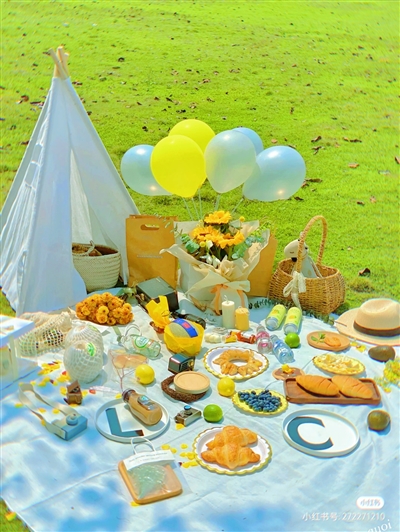 一张地毯+一地美食,仅此而已?当然不,米色帐篷支起来,餐布要ins风的,面包装在编织篮内,鲜花、气球、美酒、火锅……还不够,还要请经营野餐服务的餐饮公司策划、跟拍。这其中,分明又是一条专业化的上下游产业链。