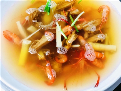 干菜浦头河虾汤:萧山没人不晓得干菜浦头。夏天一碗菜浦头汤能打开我们的味蕾。倘若在鲜滋滋的干菜浦头汤里再放上河虾,那更是鲜上加鲜。