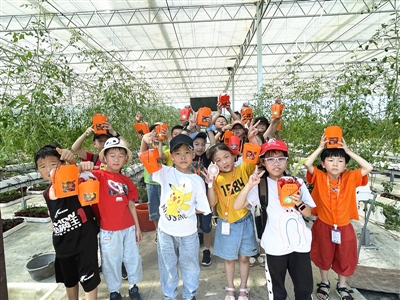 来到山青水秀的戴村,呼吸着新鲜的空气,小记者们坐上花海小火车,欣赏田园风光。放眼望去,满目皆绿,小记者纷纷感叹大自然的美丽风光。不远处的玻璃房里种植着五彩有机小番茄,也热情的欢迎着小记者们的到来。本次活动的重要环节就是让小记者们体验采摘的乐趣。“哇!这里有黄色的小番茄!”“这个小番茄好好吃呀!”小记者们一边采摘,一边发出了各式各样的感叹。品尝着纯天然的有机小番茄,还能亲自采摘一篮与家人分享,小记者们都热情高涨,采摘起来更是干劲十足。工作人员还耐心地给大家讲解了有机小番茄的特点和生长习性,解答了小记者们的各种疑惑。不一会儿,小记者们就都收获满满,完成了乐趣采摘,开心地和自己的劳动成果合照留念。