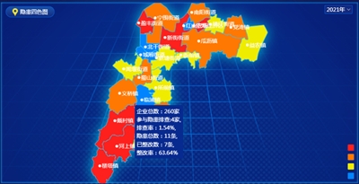 企业数量、隐患总量、检查率、整改率等维度是辖区隐患情况的重要数据,通过后台整理“隐患账本”,建立模型,绘制镇街隐患四色图,直观地了解全区各镇街隐患情况。