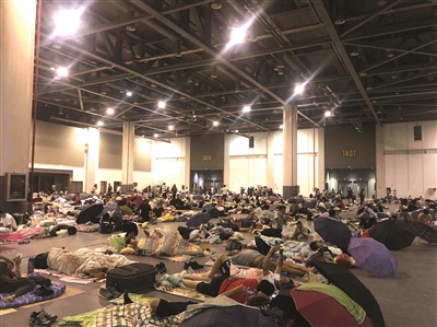 当时展厅里已安置了不少人员。陈永正一家找了个地方,并排铺好被子安顿下来。展厅里供应热水,有公共厕所,洗脸、喝水都很方便。中央空调一直开着,温度适宜。换了个新地方,大家一下子都睡不着,但只要一家人在一起,每个人都觉得很安心。