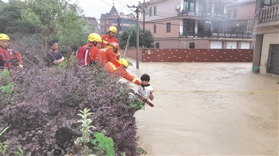 在进化镇开展救援的,还有湘湖救援站消防队员。当他们接到报警赶到祝家村时,很多地势低的民房一楼已经泡在水里。他们的任务是救出困在民居二楼的群众。消防车距离目标地点还有100多米时,却实在过不去了。“大家都下车走过去!”指挥员一声令下,大家拉起安全绳,沿着马路中间逆流前行。来到被困群众的民居前,迅速营救了12名被困群众。