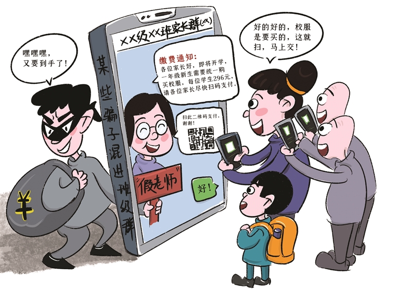 孩子一开学,各种有关学习缴费和校园活动事项也多了起来。每到此时,骗子们也会伺机而动,变着法地骗取家长们的钱财。 俞钦洋 画