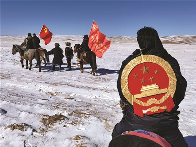 青海省果洛藏族自治州玛多县平均海拔4500米以上,人口居住分散,交通十分不便,这给普法宣传、审理案件、送达文书带来许多困难。为让群众少跑腿,玛多县人民法院工作人员骑马下乡入村,把法庭“搬”到了牧民帐篷前,及时受理与群众生产生活相关的赡养、抚养、婚姻家庭纠纷、财产纠纷等案件,实行就地立案、就地审理的方式,方便群众诉讼。图为12月20日,玛多县人民法院的“马背法庭”成员在下乡途中。