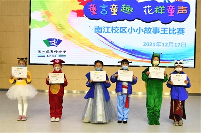 经过前期的海选,18位选手脱颖而出,参加校级决赛。小选手们在舞台上落落大方、有声有色、大放光彩。瞧,漂亮的衣服、有趣的头饰、可爱的动作,都在诉说一个个异彩纷呈的故事。狡猾的狐狸、空有理想的猪、愚蠢的乌鸦、勇敢的雨来等,小选手惟妙惟肖的表演赢得了评委老师和同学们的阵阵掌声。