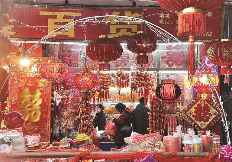 近日,一些商铺挂满了灯笼、春联、窗花、虎年饰品等,喜庆氛围日益浓郁,市民纷纷选购“年货”,过个火红年。