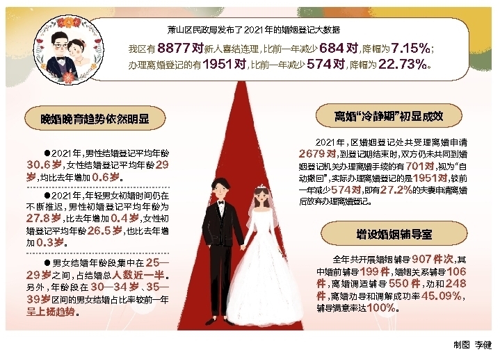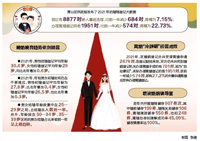 据区民政局公布的数据显示,2021年男性结婚登记平均年龄30.6岁,女性结婚登记平均年龄29岁,均比去年增加0.6岁,晚婚晚育的趋势依然明显。