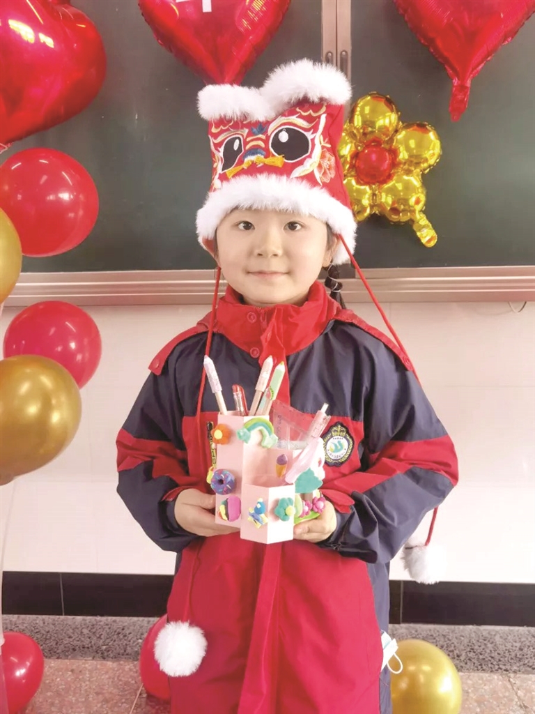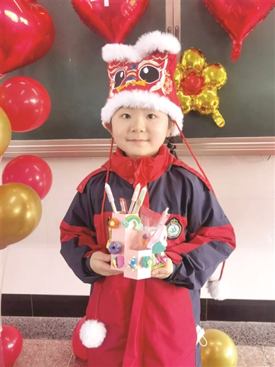 另一边,党山小学205班的同学则戴上了虎头帽,变身可爱的小老虎,迎接新年的到来。他们不仅收到了一份大大的零食盲盒,还有一个很有特色的自制笔筒。这个笔筒是班主任陈佳丽老师特意为孩子们准备的,上面粘贴的装饰彩泥则是同学们各自的作品。