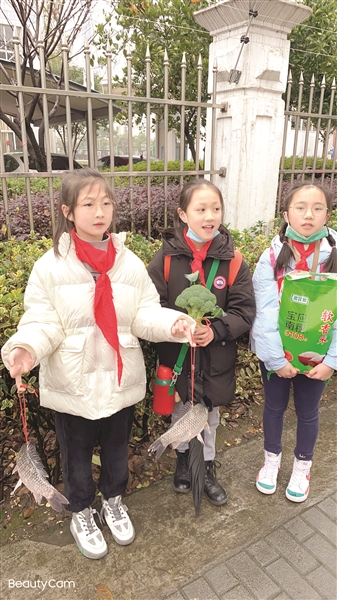 在高桥金帆实验学校的校门口,406班的同学们无疑成为了人群中最亮的风景,只见他们有的双手抱着一袋大米,有的拎着一条不时蹦跶两下的鱼,还有的则拎着一颗绑了红绳的西兰花,格外引人注目。