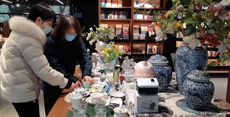 地处城区萧绍路上的萧山书城,作为全区规模较大的书店,既是一片书的海洋,也是各类小艺术品、工艺品与日常生活用品的展示区。图为客户在挑选精美的碗碟用具。 记者 王建平 摄