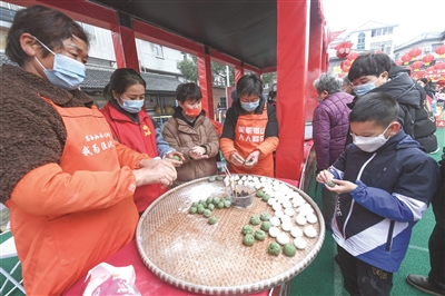 昨日,浙江省杭州市富阳区渔山乡和里山镇共同举办的2022农村文化礼堂新春民俗活动暨美丽乡村“云村晚”直播在渔山乡渔山村文化礼堂举行。活动现场进行了歌舞、戏曲等文艺演出,还有写春联、包饺子等民俗展示,为当地村民提供传统文化盛宴。本次“云村晚”活动通过网络视频直播,让留在外地过年的富阳人和留在富阳过年的外来务工人员“在线”感受浓浓的年味。图为民俗活动现场村民一起制作糯米团子。