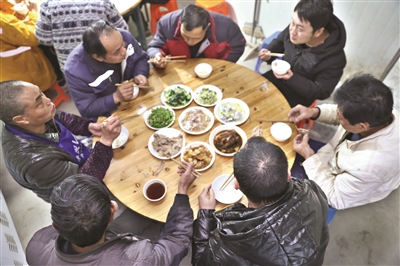 下午5点,忙碌了一天的工人们陆续走出建筑工地,齐刷刷地往食堂和宿舍方向走去。由于是小年夜,梁建军与另外两名工友约好聚一聚,用上午收到的“留萧大礼包”吃顿年夜饭。