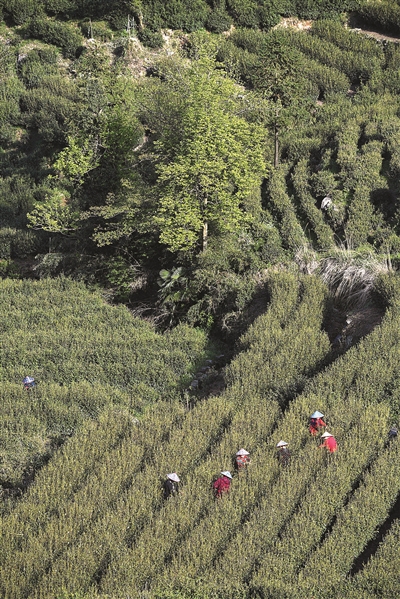 左图:4月7日,茶农在里山镇安顶山上的高山云雾茶地里采摘春茶。
