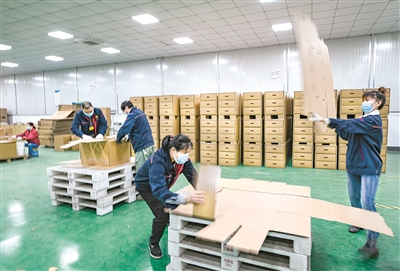 本报讯 (记者 杨圆圆) 折、按、卡扣……昨日下午,在大胜达江南园区工厂里,46岁的胡伟波额头沁汗,在她的手下,一张平坦的硬纸板正在飞快被折成长47厘米、宽38厘米、高64厘米的纸盒。速度稳定,一分半钟折一个,这样的纸盒她和搭档一天可以折400多个。“我们手脚得快点,这批货等着去帮忙呢。”胡伟波说。