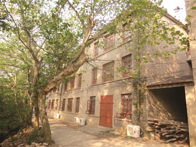 定山山巅如履平地,场部建筑三三两两,掩映在绿荫之中。其中一幢三层的青砖灰瓦的苏式小楼格外显眼,青砖朱棂,质朴无华。此建筑西面入口处墙上有一水泥碑体,上书“教学楼浙江省湘湖师范于一九六五年九月实行半农半读六五年十一月由浙建公司建筑此楼面积一千六百平方米全校师生员工都参加基建劳动”。教学楼西面有古樟一棵,南面梧桐树较多,已与教学楼一般高,有的树叶子伸到三楼窗口,伸手可触摸。